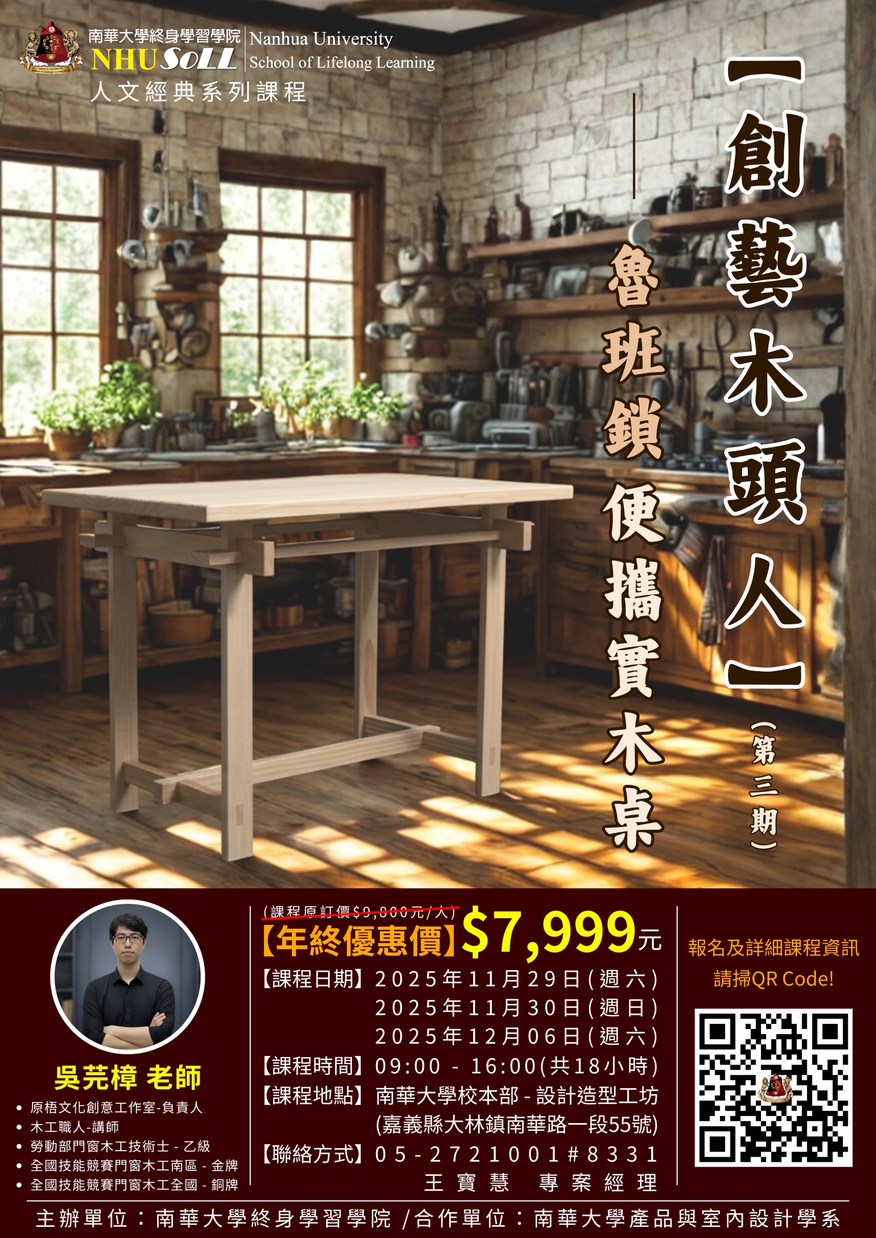 本校114年11-12月份開辦之【創藝木頭人】(第三期):魯班鎖便擕實木桌課程資訊