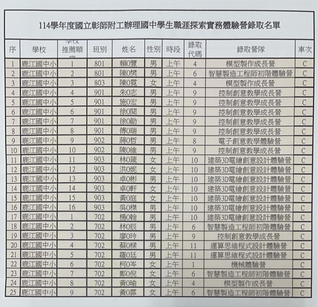 錄取名單:114學年度國立彰師附工辦理國中學生職涯探索實務體驗營