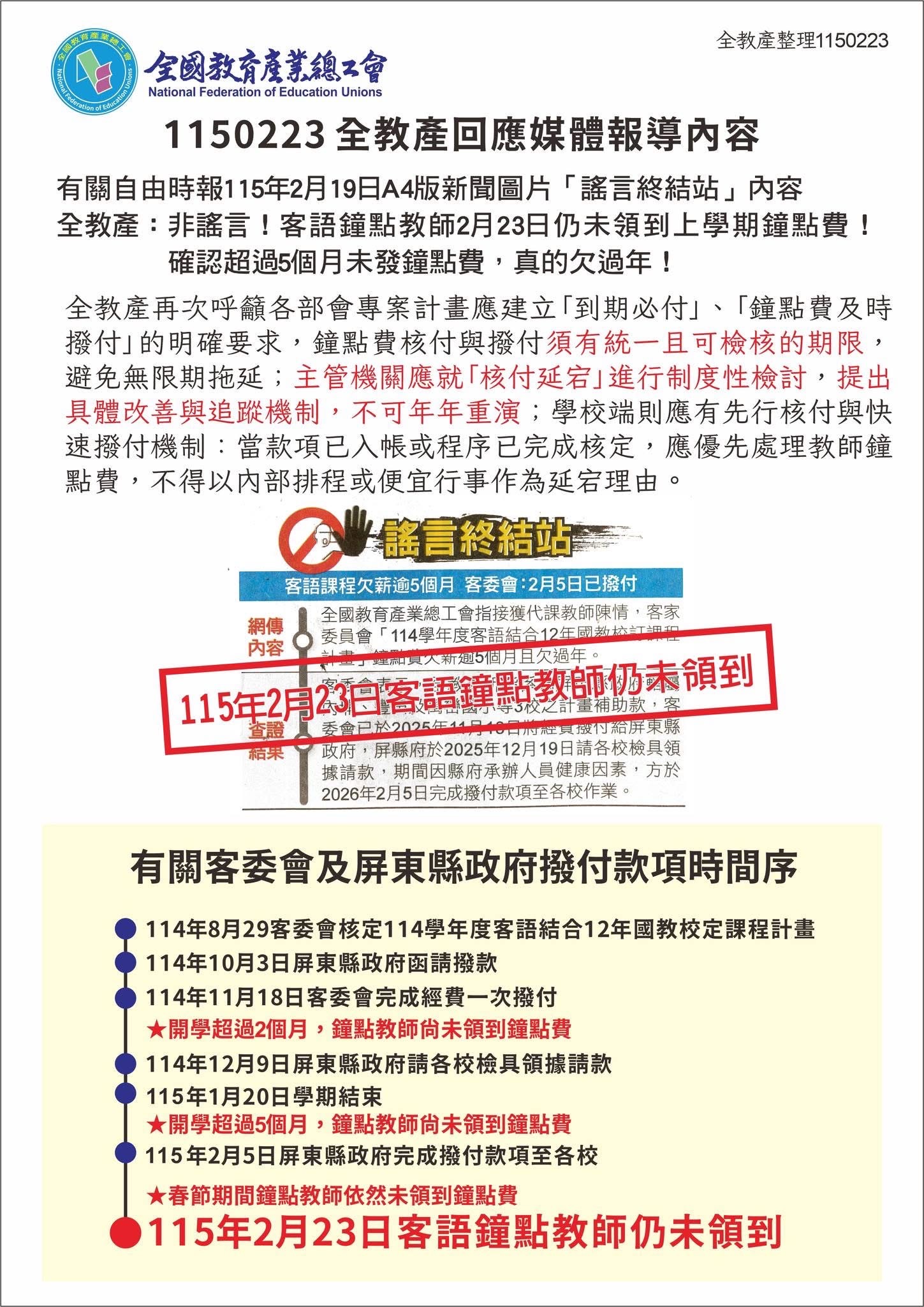 本會接獲地方工會陳情,並於115年2月13日發布新聞稿(如附件二)有關「客委會專案計畫鐘點教師遭欠薪達五個月!」一案,客委會並於同日下午發布新聞稿:「客委會「114學年度客語結合十二年國教校訂課程計畫」各校申請計畫,均於114年8月29日核定補助金額。據瞭解本次全教產所指係為屏東縣政府轄屬內埔國小、豐田國小及萬巒國小等3校之前項計畫補助款;該府於114年10月3日函請本會撥款,本會已於114年11月18日完成經費一次撥付該府……經洽詢屏東縣政府表示業於114年12月19日請各 校檢具領據請款,期間因縣府承辦人員健康因素,方於115年2月5日完成撥付款項至各校作業。」回復在案,合先敘明。 |
