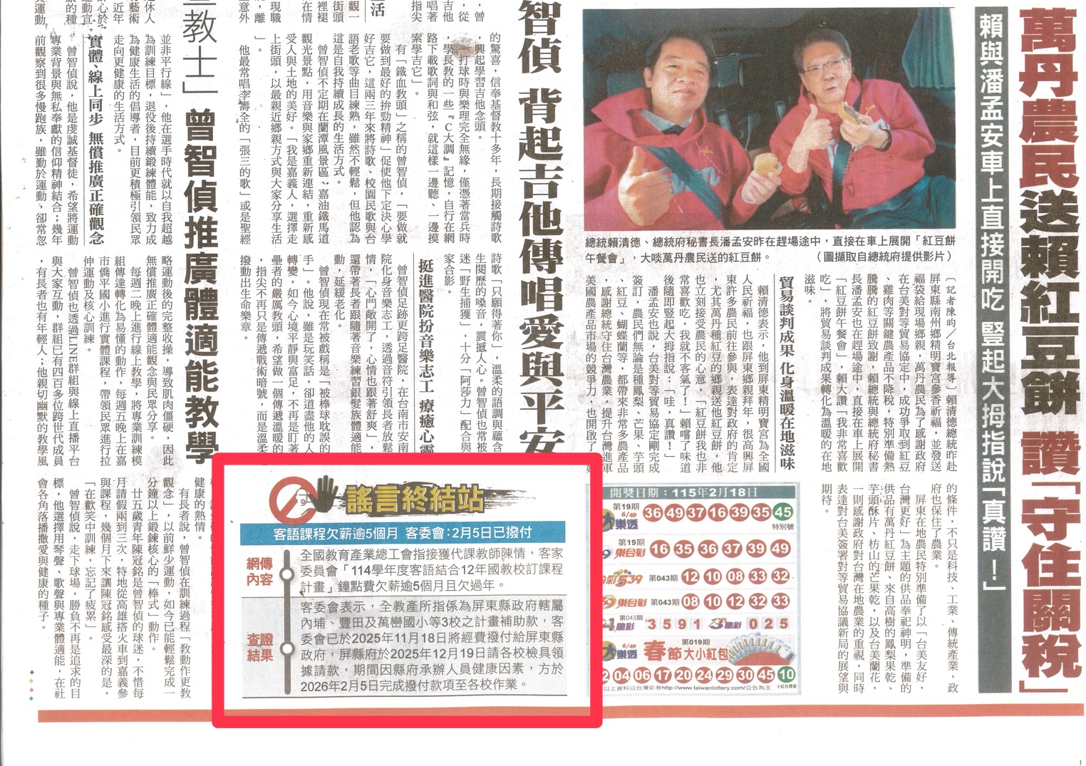 自由時報於115年2月19日A4版新聞圖片「謠言終結站」內容(如附件一)經本會查證並非謠言,特此澄清